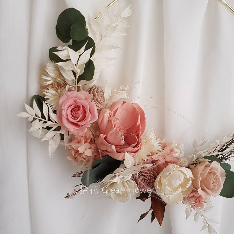 花材經自然乾燥與漂白處理,呈現溫柔的白色系調性,能平衡作品配色、增添層次感與空氣感。